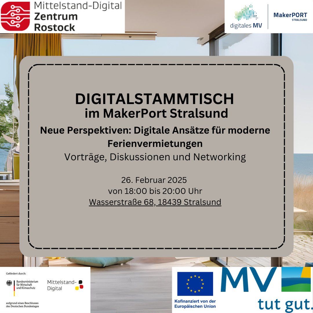 Der MakerPort Stralsund lädt herzlich zum nächsten Digitalstammtisch ein – dieses Mal mit dem Schwerpunkt auf digitalen Trends und Technologien für die Ferienvermietung. Die Veranstaltung richtet sich an alle Akteurinnen und Akteure der Tourismusbranche, insbesondere Vermieter und Betreiber von Ferienunterkünften.