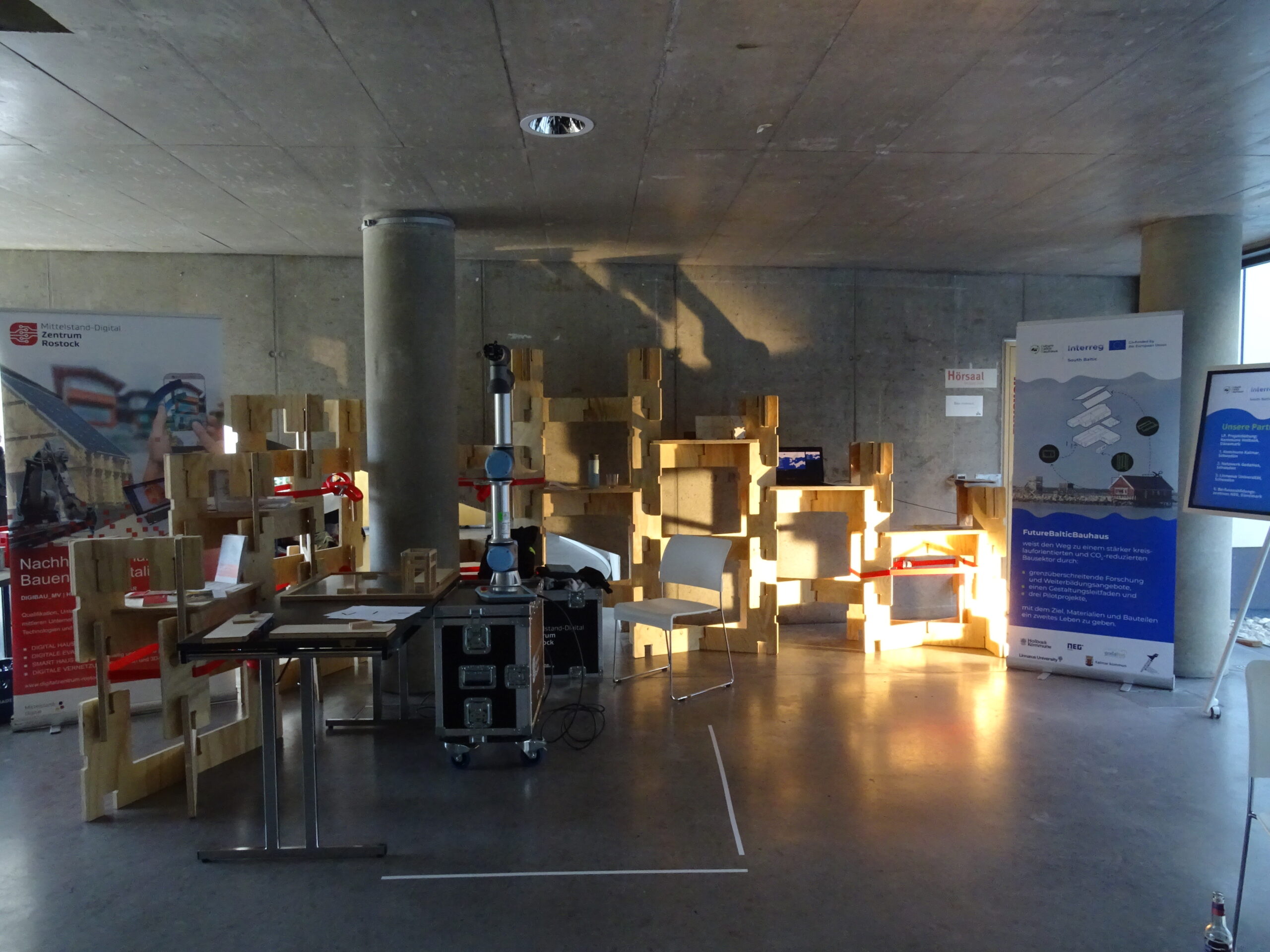 Aus dem Projekt DIGIBAU_MV wurde die Mobile Demonstrationswerkstatt vorgestellt – Sie zeigt den mit digitalen Hilfsmitteln vorgefertigten Messestand und den Roboterarm, welcher die Montage im seriellen Bauen veranschaulicht.