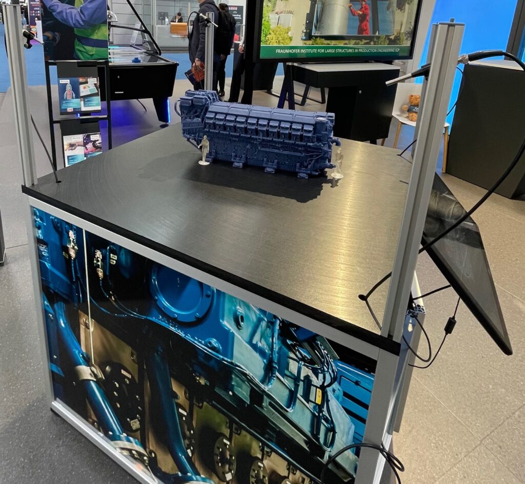 Hören, das mit einer Maschine oder einer Fertigungsanlage etwas nicht stimmt, noch bevor man einen Fehler sehen kann, das war bisher nur für ganz wenige Stellen in einer Maschine oder Anlage möglich. Dank der Entwicklung akustischer Sensornetzwerke und einer selbstlernenden adaptiven Mustererkennung ist es Forschenden des Fraunhofer IGP nun gelungen, Schadstellen allein durch Geräuschveränderungen zu ermitteln und die Fehler einzelnen Teilsystemen in Großmotoren zu zuordnen. Hierdurch können notwendige Instandsetzungsmaßnahmen frühzeitig erkannt und veranlasst werden, was zu einer Erhöhung der Lebensdauer und der Zuverlässigkeit des Großmotors führt. Interessierte können die Methode an einem Demonstrator im Fraunhofer IGP erleben.