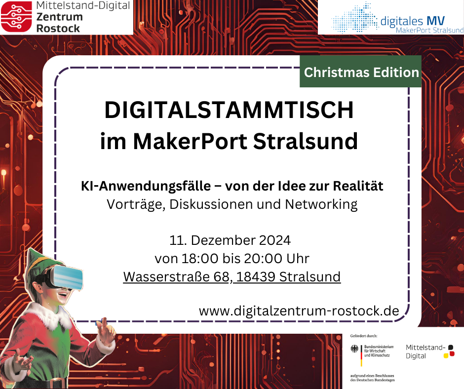 Der Digitalstammtisch des Mittelstand-Digital Zentrums Rostock in Kooperation mit dem MakerPort Stralsund lädt herzlich ein zur Christmas Edition mit dem Thema: