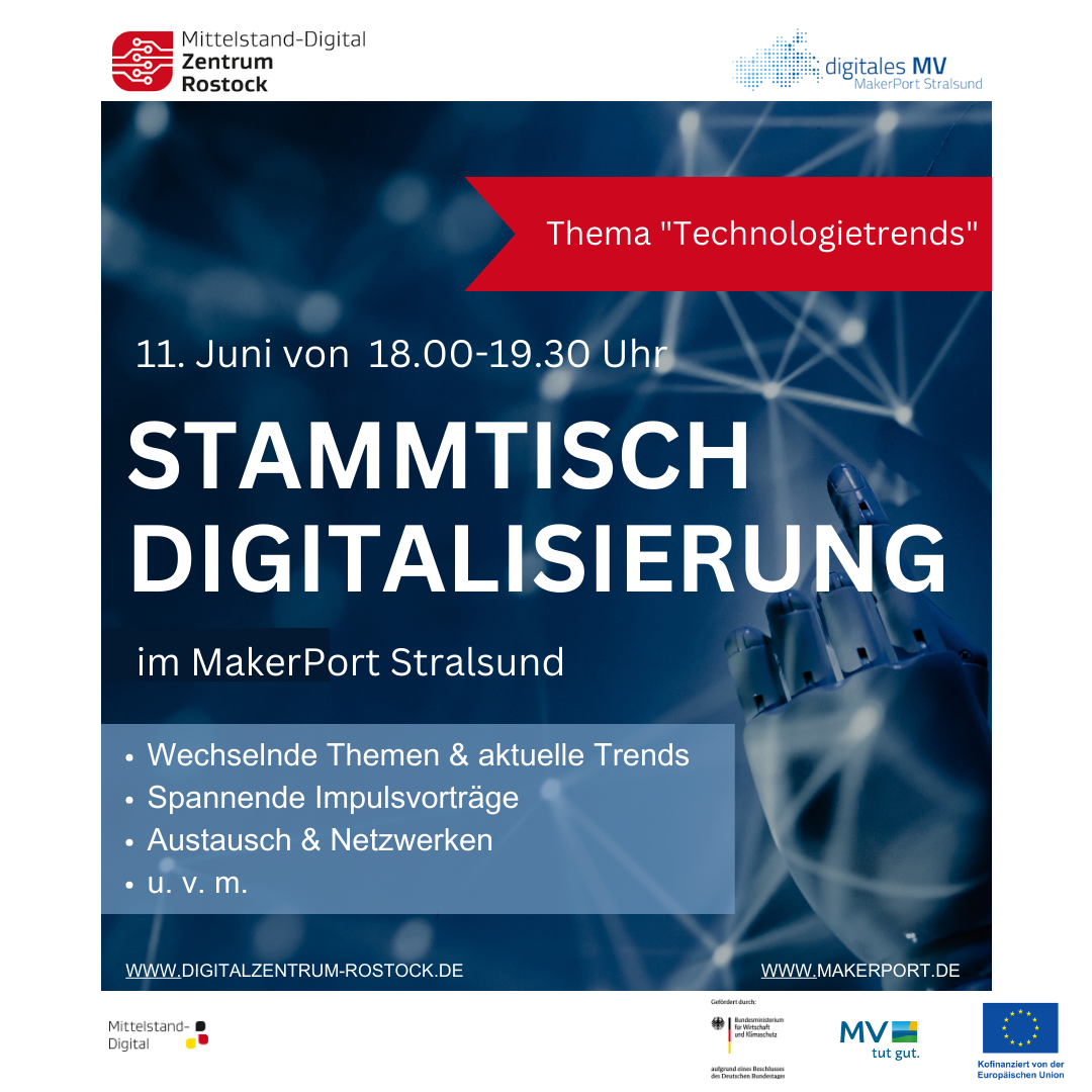 Beim Stammtisch Digitalisierung im MakerPort in Stralsund möchten wir Macher:innen der unterschiedlichsten Branchen unserer Region zusammenbringen, um über verschiedene Themen rund um die Digitalisierung zu informieren, Erfahrungsaustausch anzuregen und uns untereinander besser zu vernetzten. Tauschen Sie sich regelmäßig mit uns alle zwei Wochen zu innovativen Themen, Trends und neuen Technologien rund um die Digitalisierung aus. Spannende Impulsvorträge eröffnen den Abend.