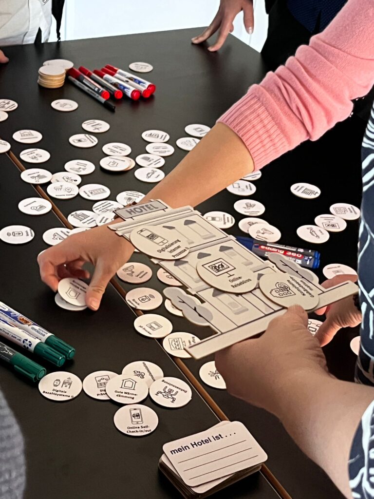 Ergebnis der Aufgabe war ein SMART Hotel Check. Nachdem alle Hotelbauenden Personen ihre Elemente ausgewählt haben, wurde mithilfe eines Drei-Stufen-Systems für die Bewertung von SMART Hotels, diskutiert und spielerisch erkannt, wie diese Elemente den Stand der Digitalisierung eines Hotels beeinflussen. Wir hatten einen anregenden Meinungsaustausch über die Auswirkungen der Digitalisierung auf Energieeffizienz, nachhaltige Planung und Gesundheit.