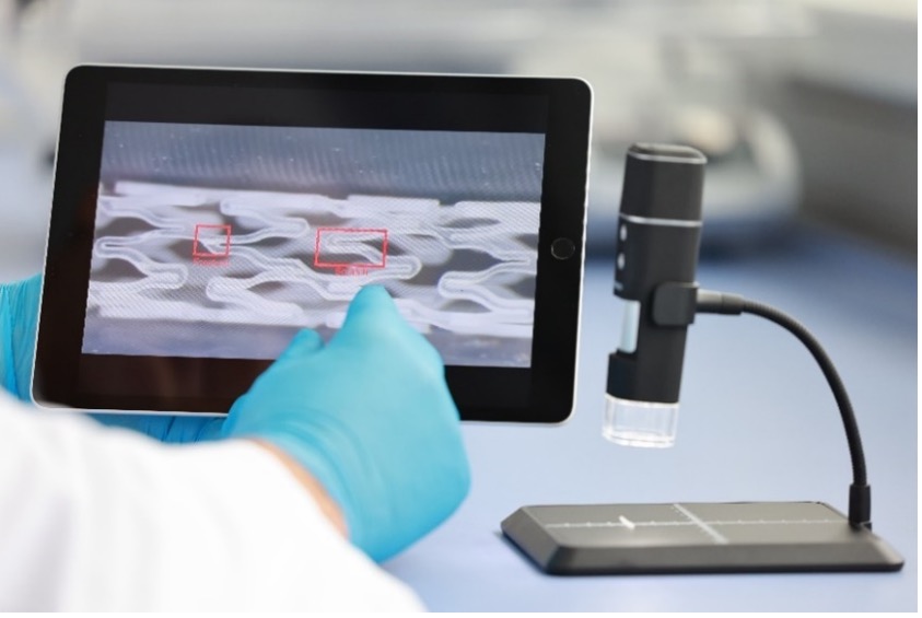 Abbildung: Objekterkennung in der Qualitätskontrolle für Medizinprodukte mittels Künstlicher Intelligenz veranschaulicht durch den KI-Trainer am IIB e.V., Dipl.-Ing. Jan Oldenburg, am Beispiel eines Stents.