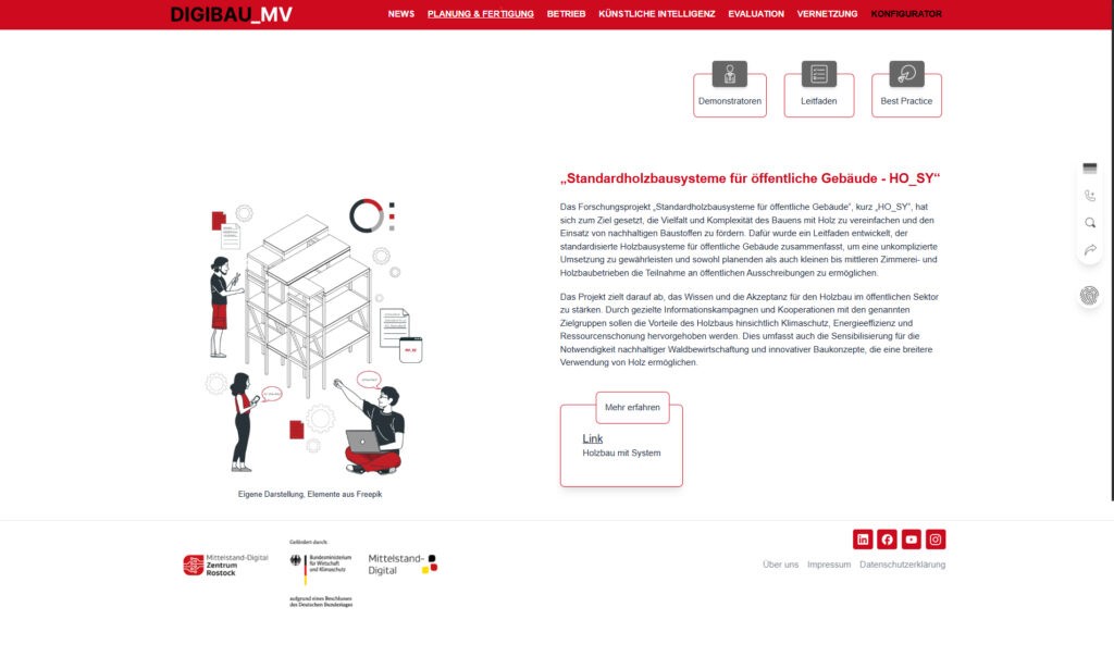 Eine besondere Möglichkeit bietet unser Konfigurator-Tool (https://digibau-mv.net/konfigurator ) – eine neue Initiative zur Digitalisierung der Anforderungserfassung und zur Erstellung maßgeschneiderter Lösungen auf Grundlage individueller Eingaben. Der Muster Konfigurator konzentriert sich auf Holzbausysteme für Schulgebäude. Basierend auf spezifischen Anforderungen unterstützt er bei der Entscheidung, welches System sich am besten für eine geplante Schulgestaltung eignet. Es handelt sich um ein einfaches, schnelles und effizientes Werkzeug, das nicht nur von Fachleuten, sondern auch von Schulverwaltungen, Bildungseinrichtungen und öffentlichen Entscheidungsträgern genutzt werden kann.
