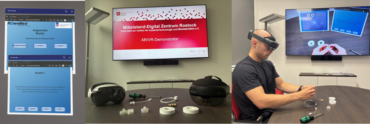 Beim Projektpartner Institut für ImplantatTechnologie und Biomaterialien e.V. des Mittelstand-Digital Zentrum Rostock erhält der Besucher eine immersive, kontextbasierte Sicht auf komplexe Arbeits- oder Assemblierungsprozesse. Diese ermöglicht ein besseres Prozessverständnis und unterstützt z.B. Onboarding, Fernunterweisung oder die Qualitätssicherung beim u.a. Zusammensetzen von Baugruppen.
