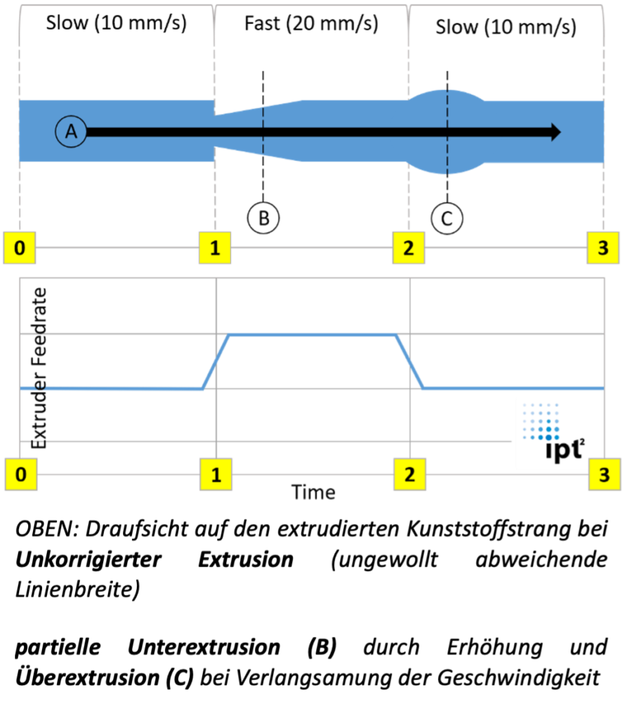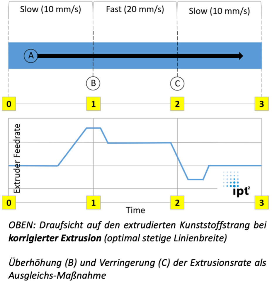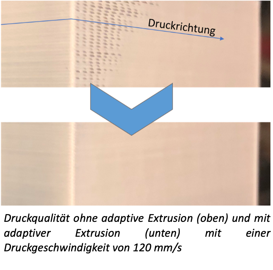 Die Ursache für Mängel in der Formgenauigkeit beim 3D-Druck liegt oft an einem unpassenden Extrusionsdruck in der Düse, an welcher der Kunststoff austritt. Die Lösung für derartige Mängel in der Geometrie ist die Entwicklung einer Funktion, welche die Extrusionsrate situationsgerecht abstimmt. Die Extrusionsrate wird durch Faktoren wie Förderrate, Düsentemperatur und die Kompressibilität der Schmelze beeinflusst. Der abschnittsweise angepasste Druck soll ein Nachfließen des Kunststoffs (= Überextrusion) bei Verlangsamung der Druckbewegungen verhindern und ein Materialdefizit (= Unterextrusion) bei beschleunigten Bewegungen beheben.